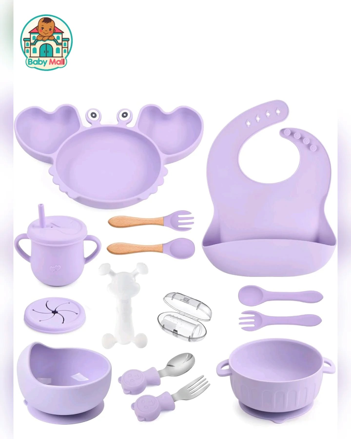 This comprehensive 15-piece baby feeding set from Baby Mall, presented in a soft lavender hue, is crafted from food-grade, BPA-free silicone, making it safe for babies learning to self-feed. The set includes a fun crab-shaped suction plate, two suction bowls, a training cup with a straw and handles, an adjustable bib, and various spoons and forks. It’s designed for easy cleaning and is safe for microwave, steaming, and fridge use, perfect for weaning and toddler feeding.