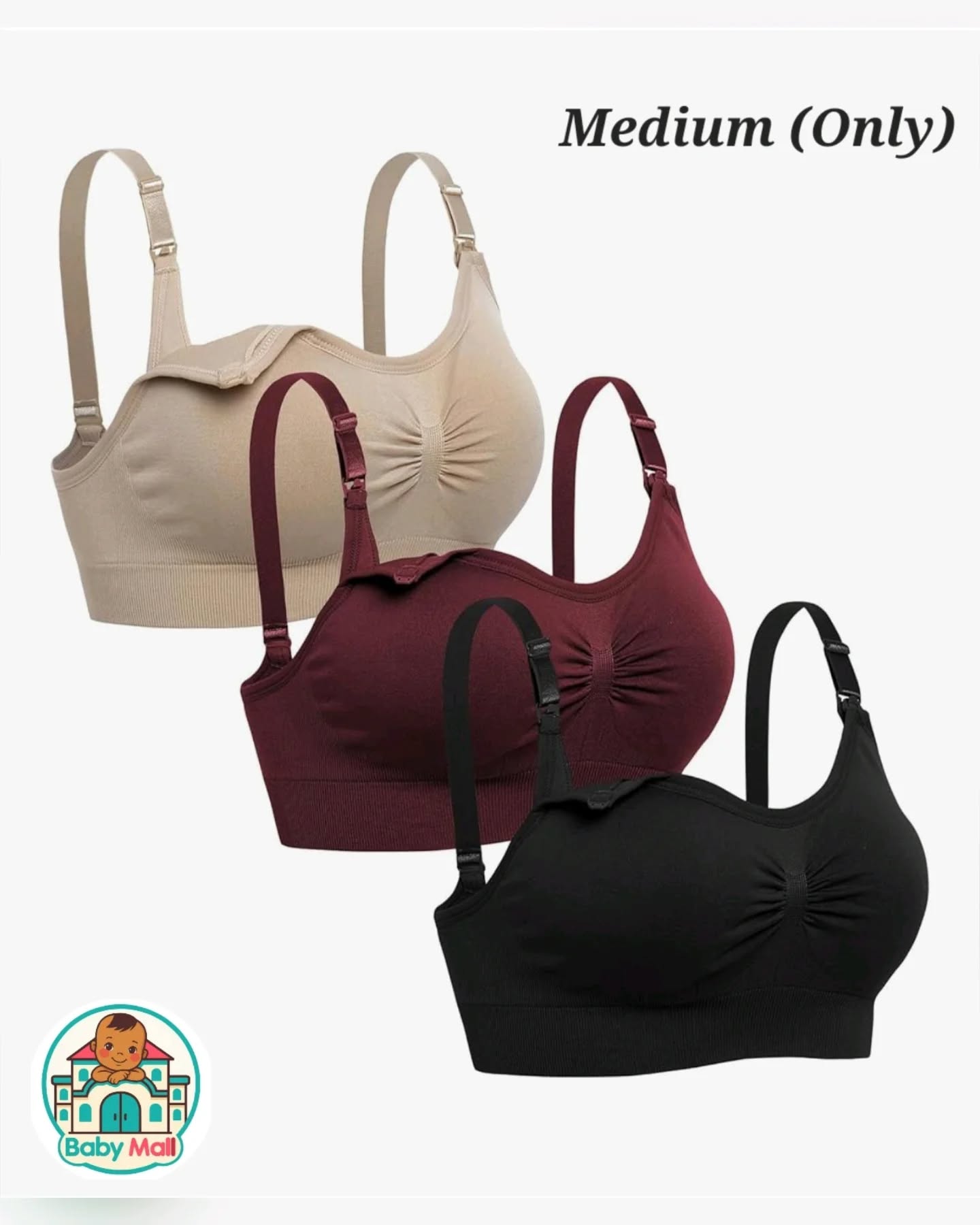 This Baby Mall 3-pack of seamless maternity and nursing bras in beige, maroon, and black offers comfort and support for expectant and new mothers. Made from soft, breathable, and stretchy fabric, these bras feature one-hand nursing clasps for easy feeding and removable pads for extra comfort and shape. Available in size Medium, they are perfect for pregnancy, nursing, and comfortable sleep.