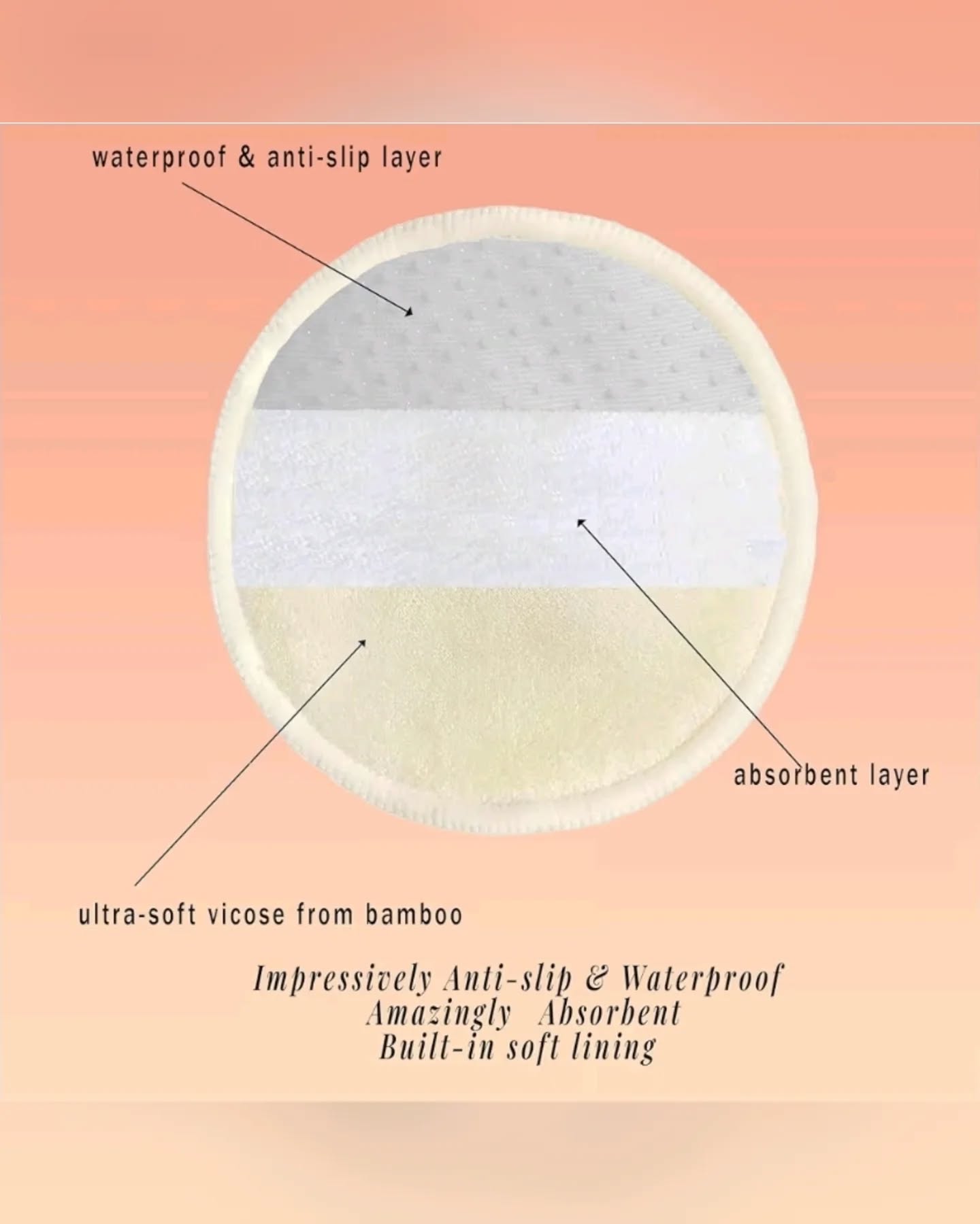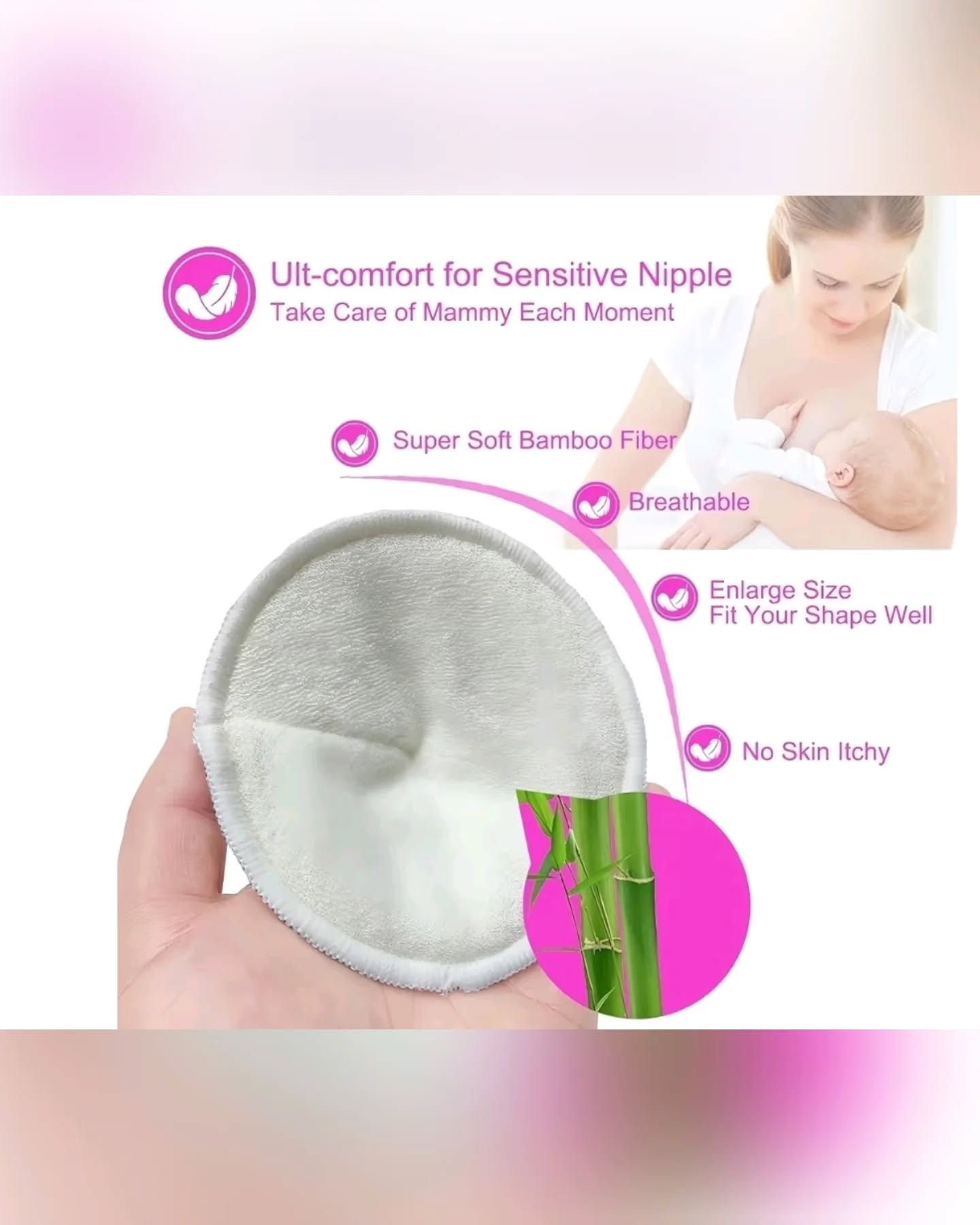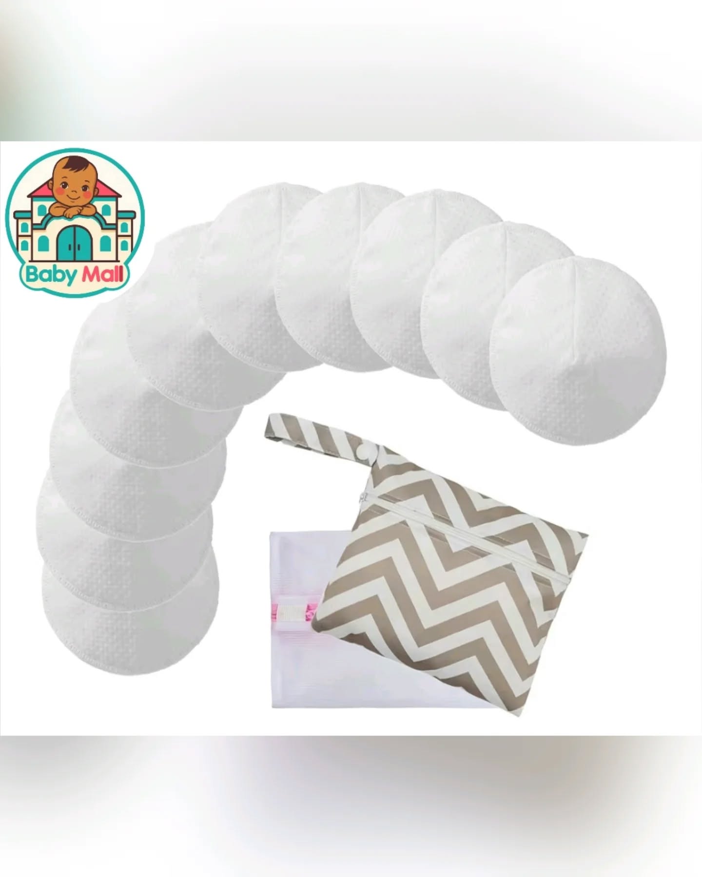 This set includes 10 ultra-soft bamboo reusable nursing pads designed to keep you dry, comfortable, and leak-free day or night. It comes complete with a wash bag for machine cleaning and a wet bag featuring a beige and white chevron pattern for convenient on-the-go swaps, essential for new mothers and postpartum care.