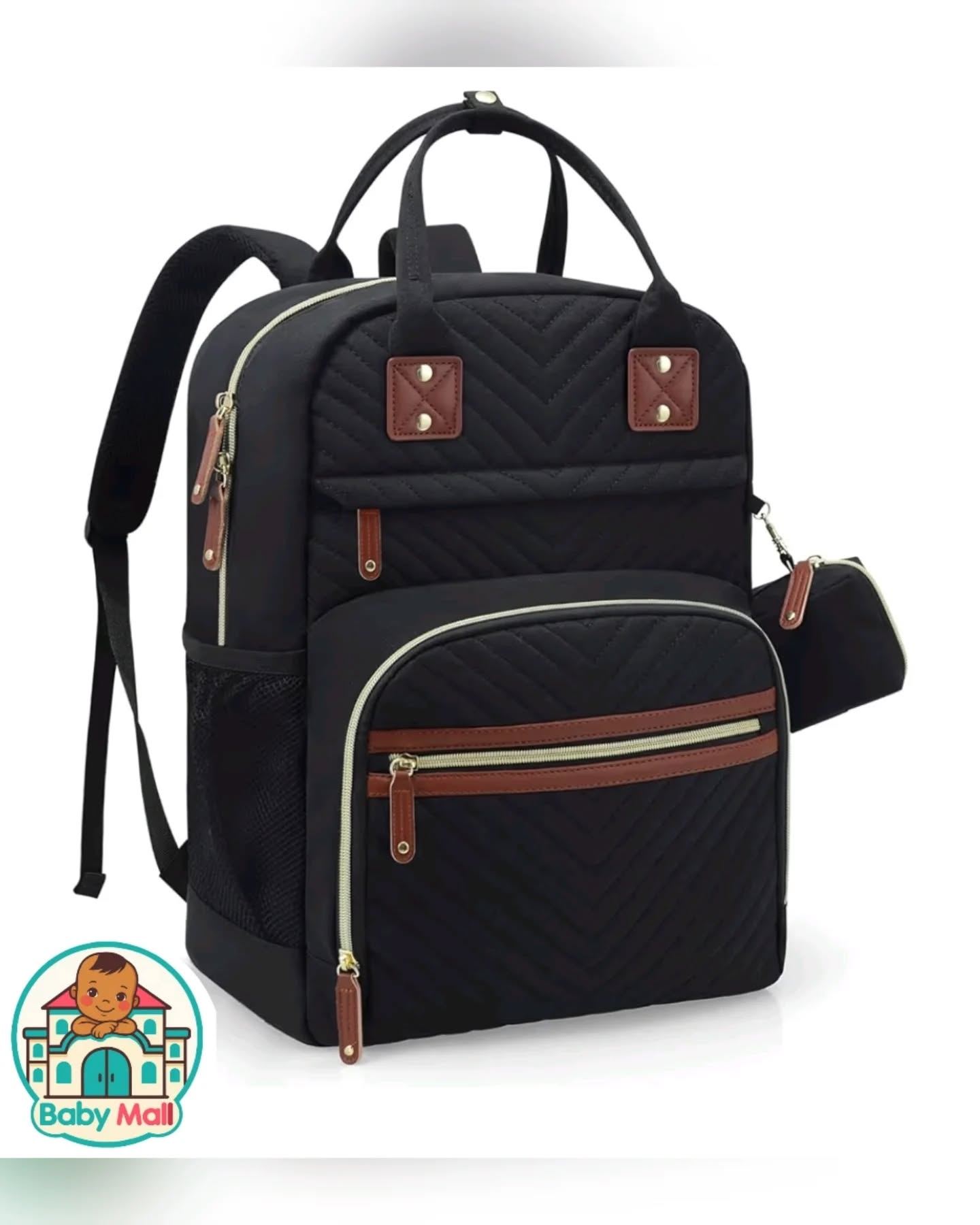 This BabyMall black gender-neutral diaper bag backpack features a stylish quilted chevron pattern on its front pockets, complemented by brown faux leather accents and gold-tone zippers. Crafted from water-resistant, odour-free fabric, this spacious yet lightweight (11.6” x 6” x 16”, 1.38 lbs) travel tote offers 13 pockets for comprehensive organization, including 3 insulated bottle pockets. It comes equipped with stroller straps, a trolley strap, and a detachable pacifier pouch, making it a highly practical and durable essential for parents on the go.