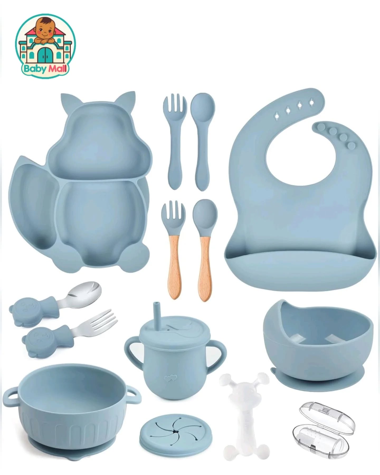 This comprehensive 15-piece baby feeding set in a soft blue color is designed for weaning and self-feeding training. Made from food-grade, BPA-free silicone, the set includes a squirrel-shaped suction plate, suction bowls, a training cup with a handle, an adjustable bib, and various spoons and forks. It is safe for microwave, steaming, and fridge use, making it easy to clean and toddler-friendly.
