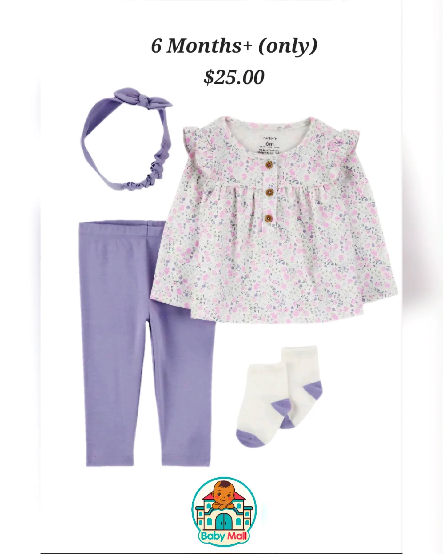 This Carter’s 4-piece baby girl outfit set includes a long-sleeved top with a soft lilac and pink floral print, comfortable solid lilac leggings, white socks with lilac accents, and a matching lilac bow headband. Designed for cozy wear with long sleeves, this set is perfect for outings and photo-ready moments. Available in size 6+ Months only.