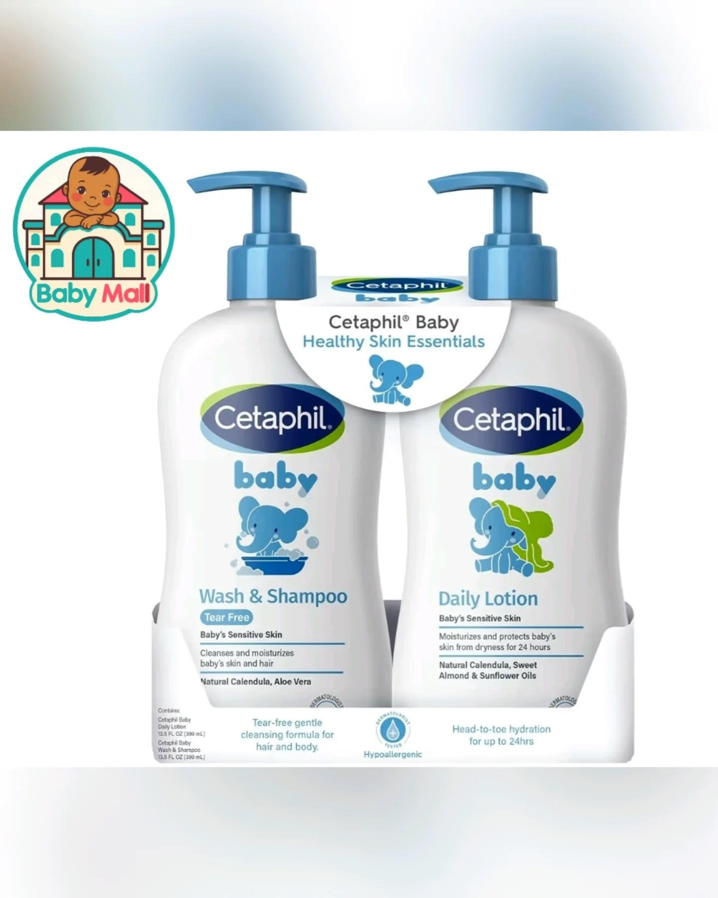 This Cetaphil Baby Healthy Skin Essentials 2-pack includes a tear-free Wash & Shampoo and a Daily Lotion, both formulated for delicate, sensitive baby skin. Enriched with natural calendula, sweet almond, and sunflower seed oils, this hypoallergenic and dermatologist-tested duo provides up to 24 hours of hydration, free from parabens, colorants, and mineral oil. Ideal for newborns and as a thoughtful baby shower gift.
