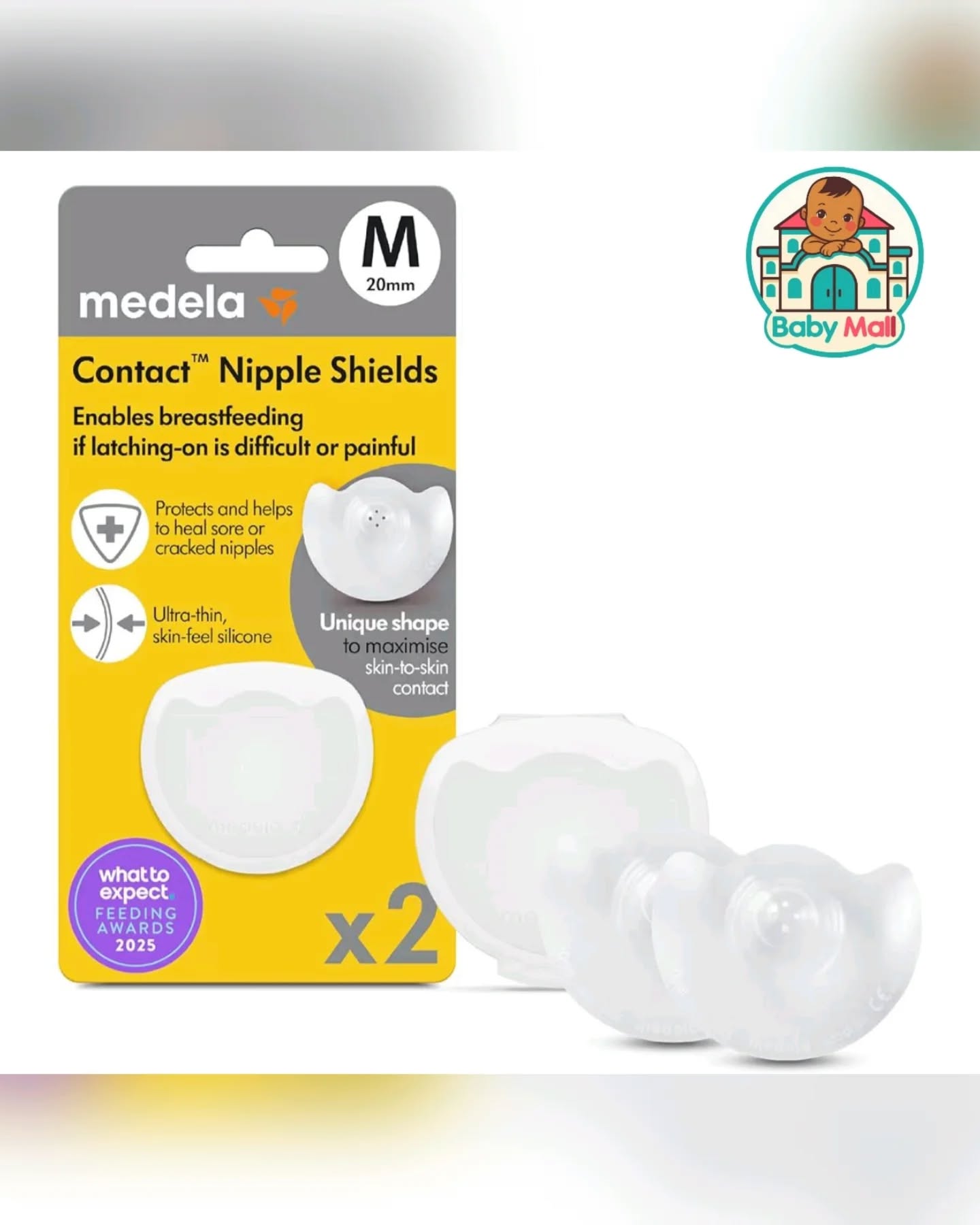 These Medela Contact Nipple Shields are designed to assist breastfeeding mothers experiencing latching difficulties, discomfort, or those with flat or inverted nipples. Made from ultra-thin, flexible food-grade silicone, they provide gentle comfort for sore or cracked skin while allowing maximum skin-to-skin contact. This pack includes two 20mm (Medium) shields and a hygienic storage case, making breastfeeding easier for both mom and baby.