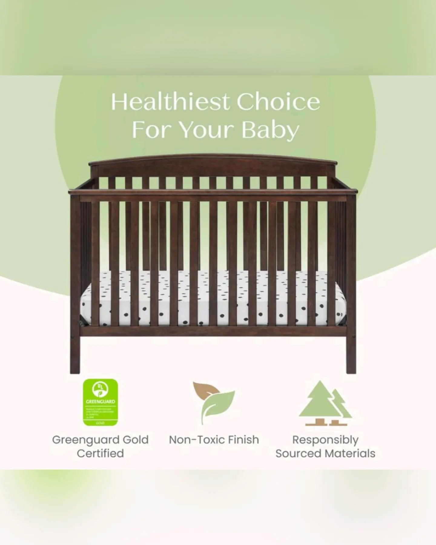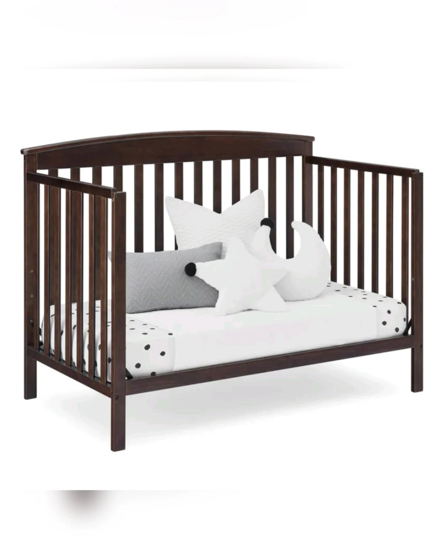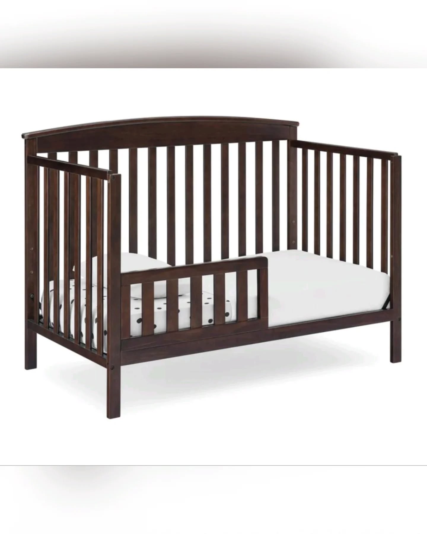 This Delta Children Hanover 6-in-1 Convertible Baby Crib in a dark brown finish is crafted from sustainable New Zealand pine and poplar wood. It features a non-toxic, lead and phthalate-safe paint process, offering three adjustable mattress height positions and converting into a toddler bed, daybed, sofa, and full-size bed (conversion rails sold separately).