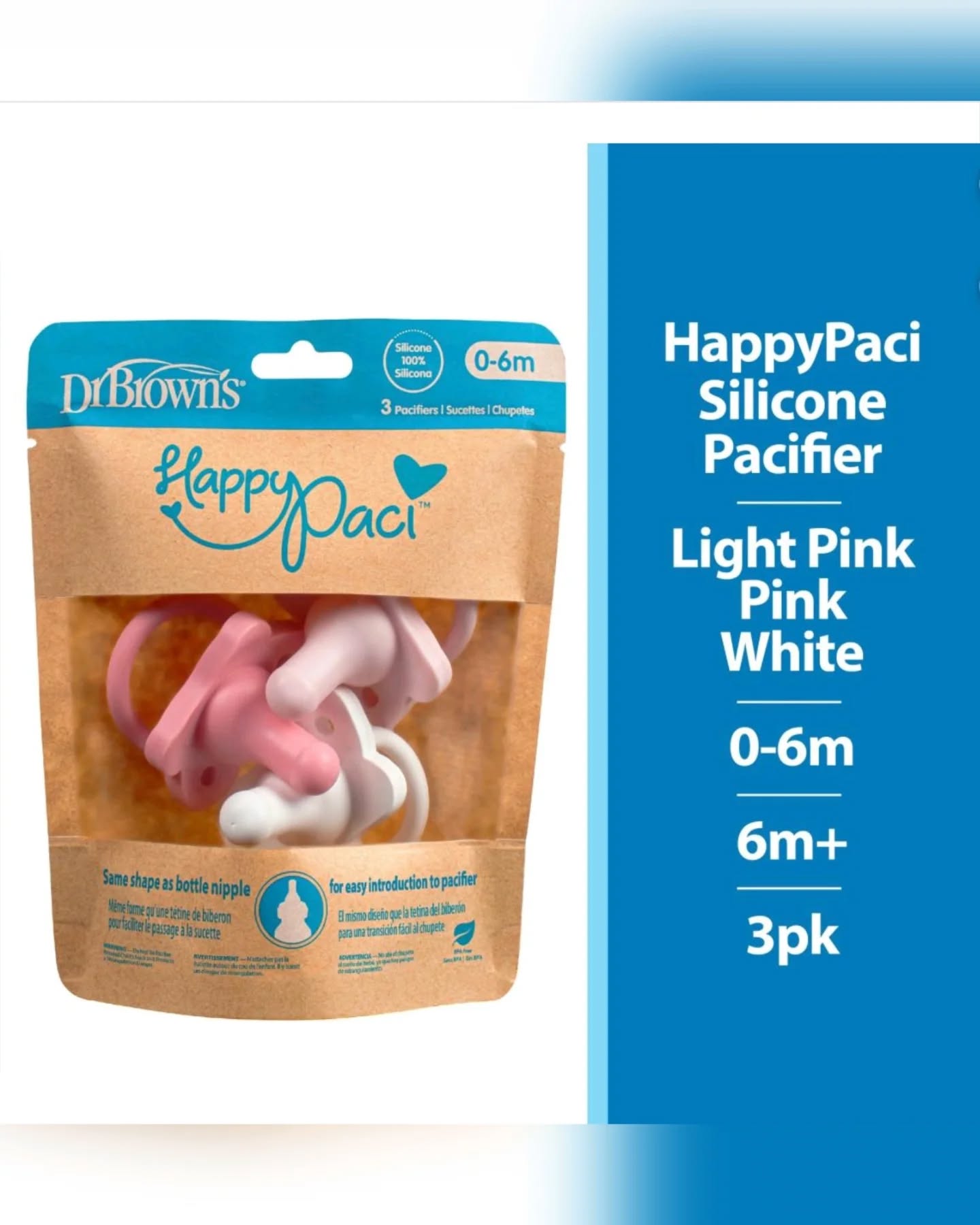 Dr. Browns Pink and White Baby Silicone Pacifiers 3-Pack, 0-6 Months