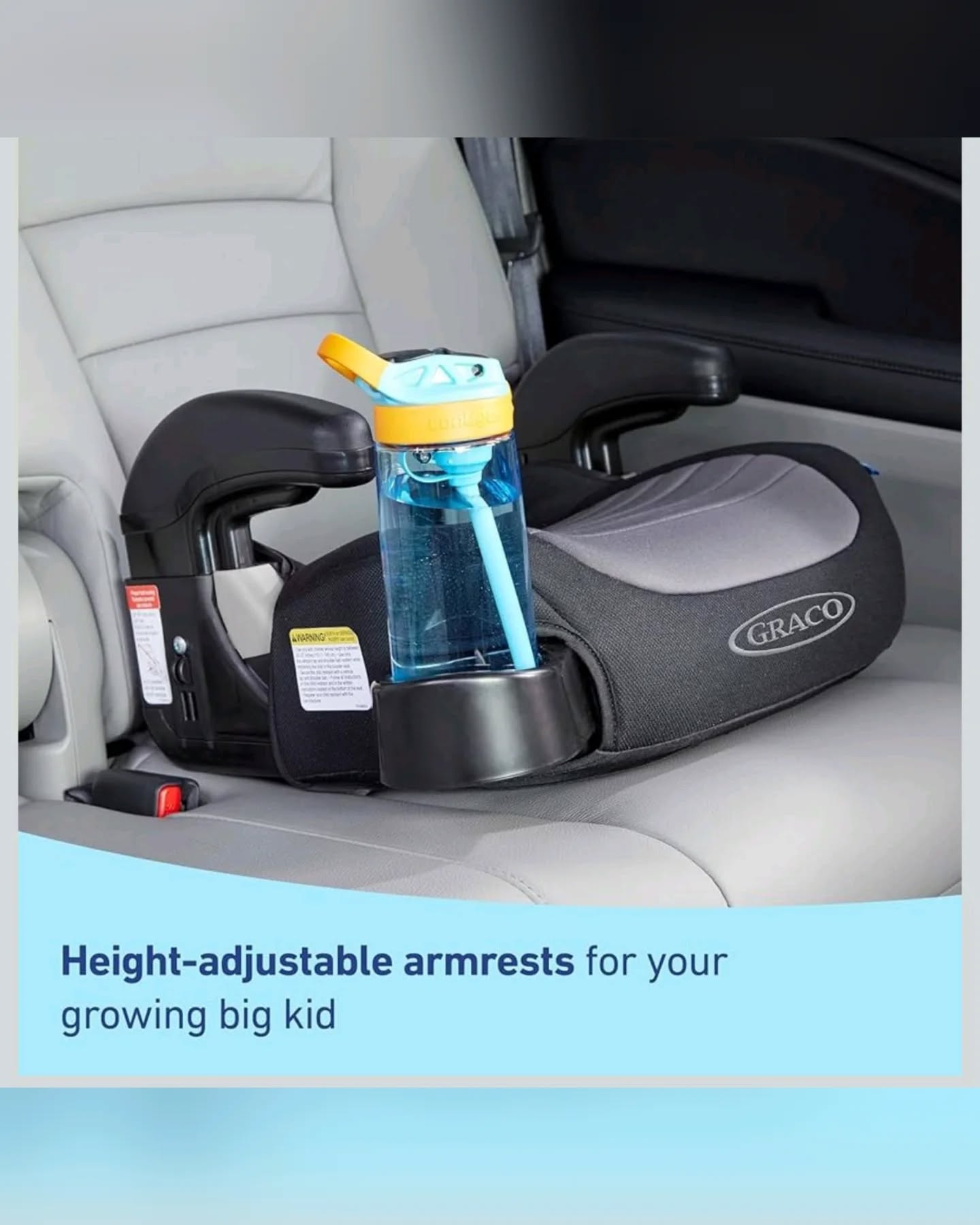 The Graco TurboBooster is a black and grey booster car seat designed for big kids aged 4-10, weighing 40-100 lbs, and up to 57 inches tall. It features adjustable armrests for comfort and convenient hide-away cup holders. This crash-tested child safety seat helps position your child correctly for the vehicle’s seat belt.
