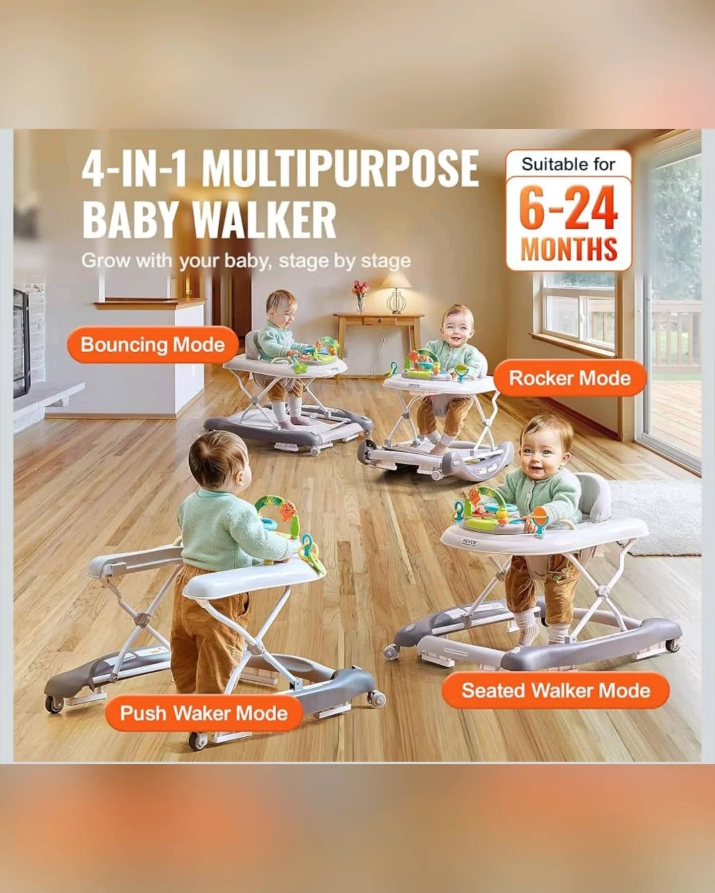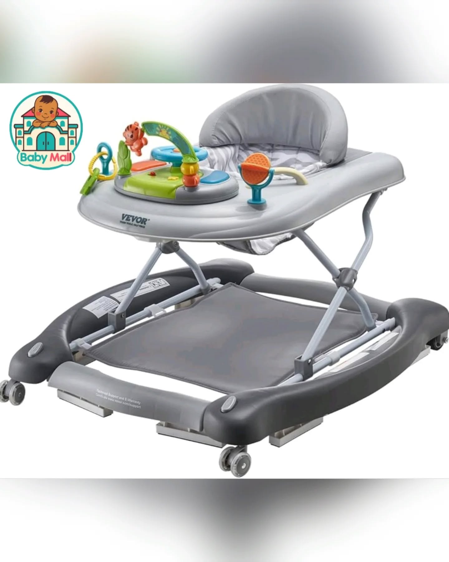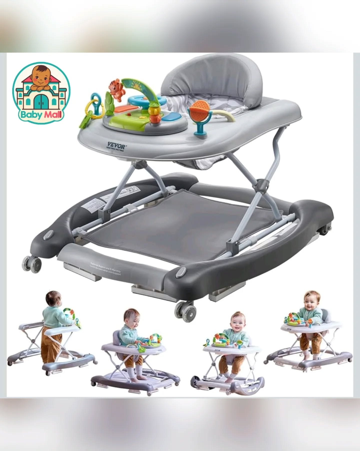 This VEVOR 4-in-1 Baby Walker Activity Center in grey offers versatile support for babies aged 6-24 months, transforming into a learning seat, walk-behind walker, rocker, and bouncer. It features a breathable high-back seat with cushioned padding, quiet rubber wheels with adjustable speed, anti-skid blocks, and a wide base for safety. The interactive play tray includes music, a windmill, and teether toys, while its 3 height levels ensure it grows with your baby.