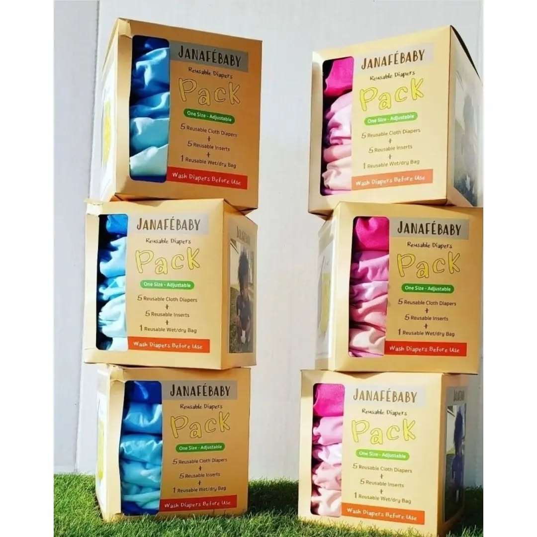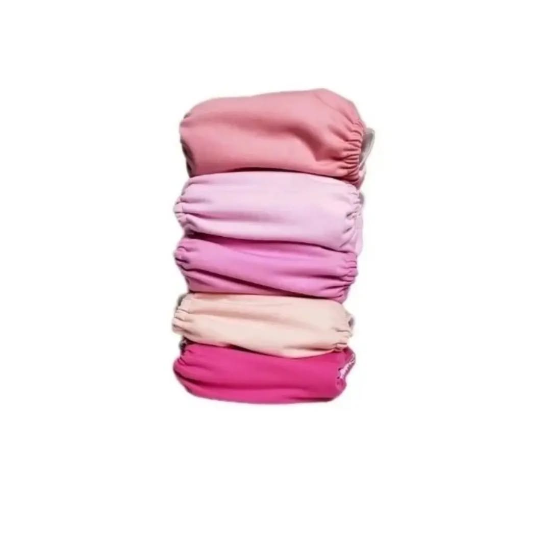 This set includes five JANAS reusable pocket cloth diapers in various shades of pink, along with a matching wet/dry bag and five four-layer bamboo inserts. Designed for babies and toddlers weighing 3kg-15kg (6.6-33 pounds), these one-size-adjustable diapers feature a waterproof polyester outer layer with breathable TPU and a soft faux suede cloth inner layer, ensuring comfort and leak protection.