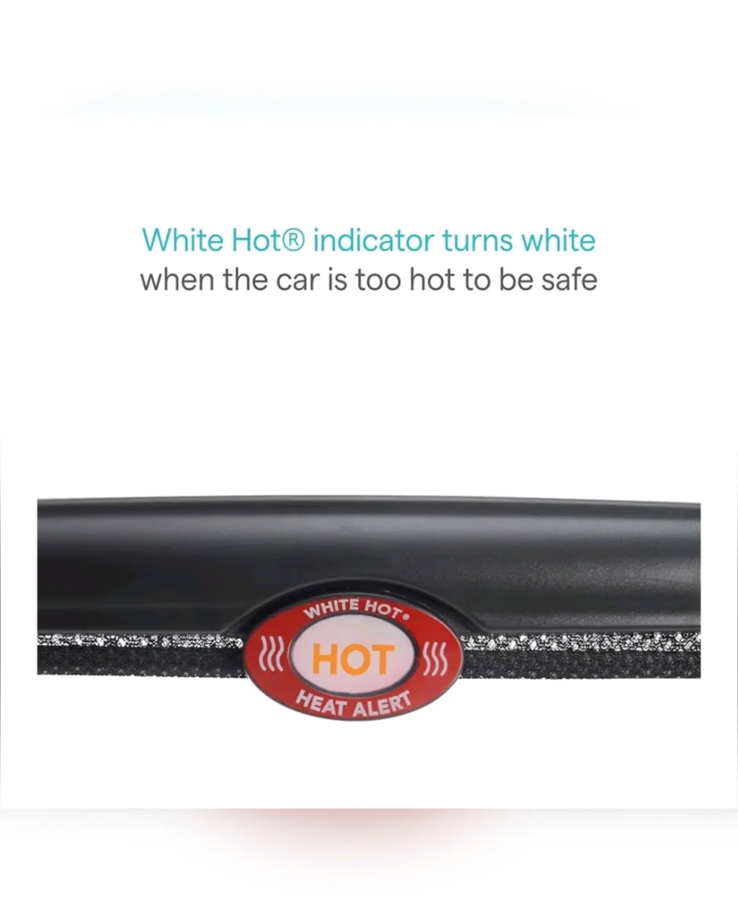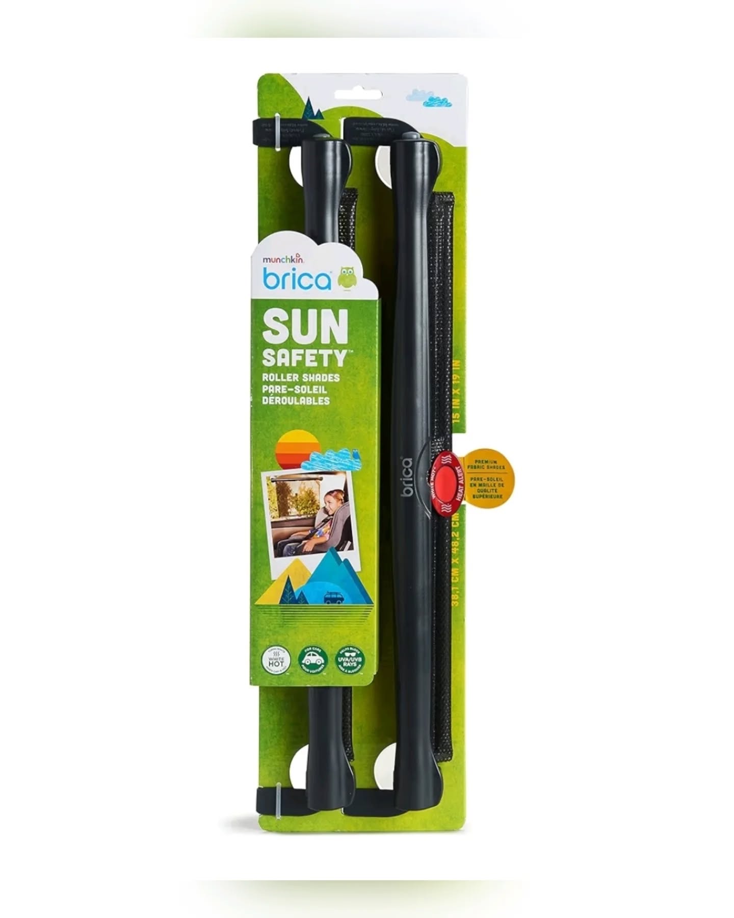 This Munchkin Brica Sun Safety Car Window Shade set includes two black mesh roller shades, each measuring 15 x 19 inches, designed to cut glare and provide full coverage for car windows. They feature a White Hotâ„¢ indicator that turns white if the car gets too hot, offering a quick safety warning for baby travel. These essential baby car accessories attach easily to most side windows, ensuring happier and safer rides for infants and children.