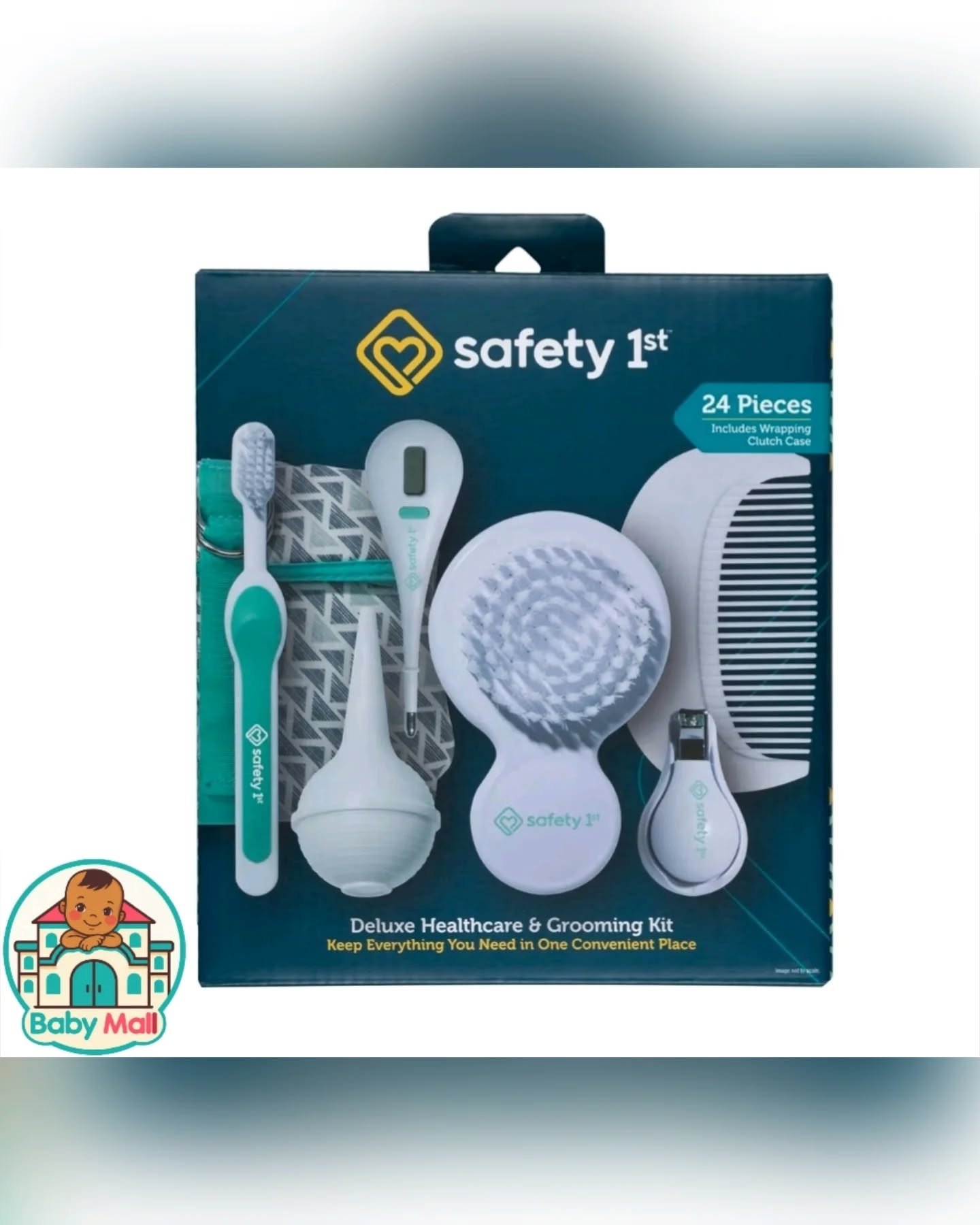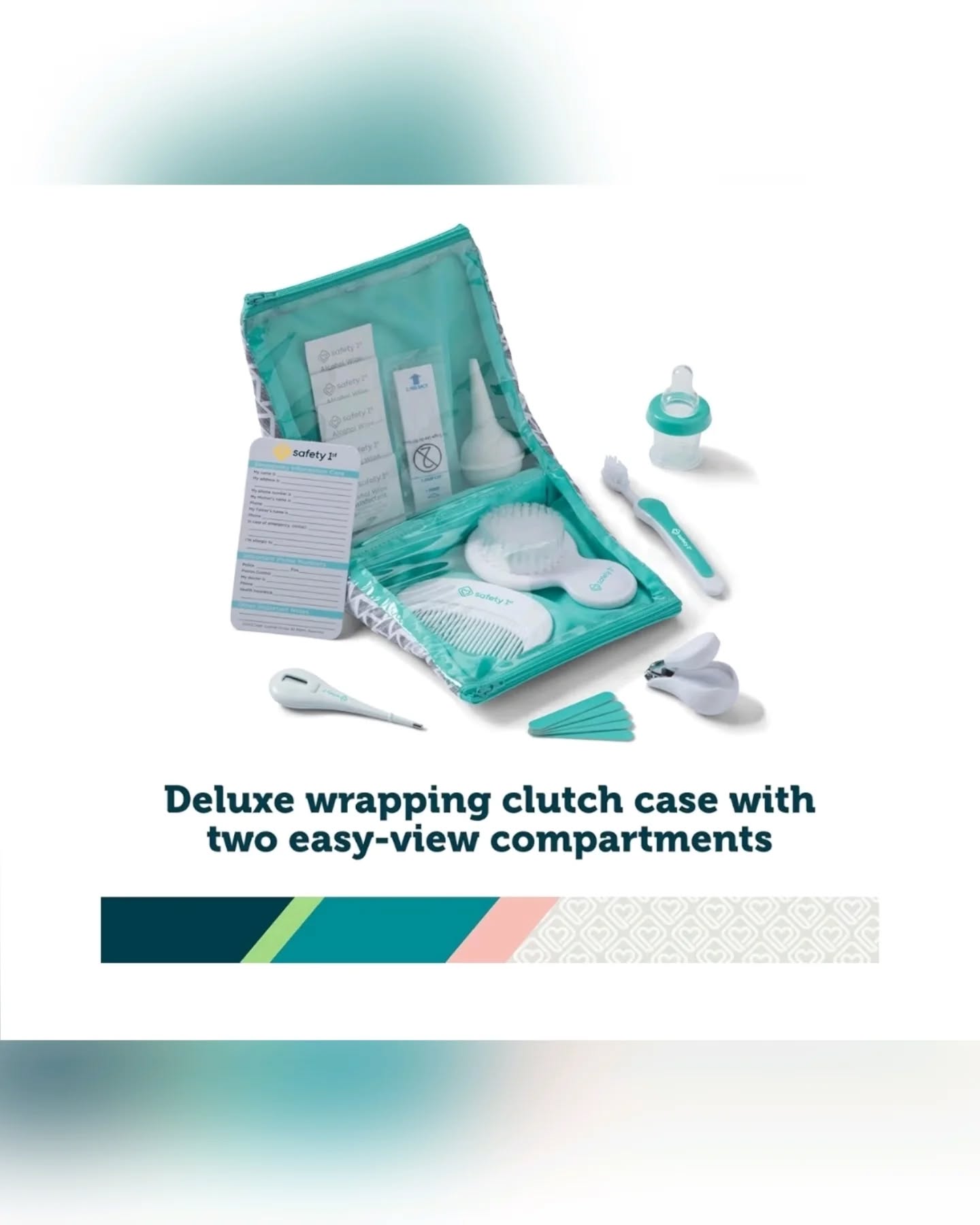 This Safety 1st Deluxe Baby Healthcare & Grooming Kit provides 24 essential tools for newborns and infants. It includes a toddler toothbrush, nasal aspirator, medicine dispenser, thermometer, brush, comb, and nail clipper, all organized within a convenient folding clutch case with easy-view compartments. Perfect for home, travel, or as a thoughtful baby shower gift, ensuring all baby care needs are met in one place.