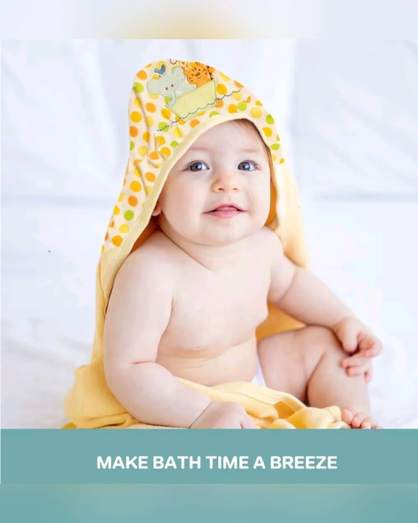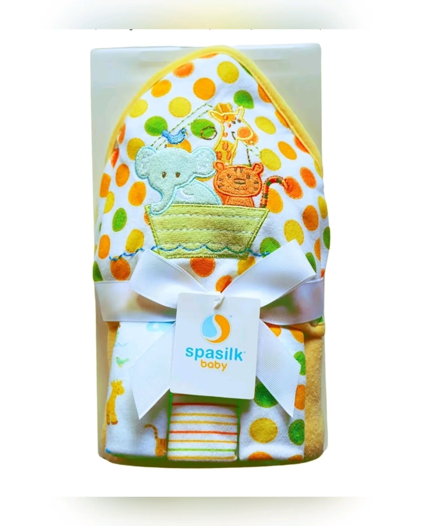 This Spasilk Baby hooded bath towel and washcloths set for newborns features a soft, plush fabric with an adorable yellow ark animal design and colorful polka dots. The set includes one cozy hooded towel and three highly absorbent washcloths, perfect for keeping baby warm and dry after bath time. This practical and charming set is ideal for baby shower gifts.