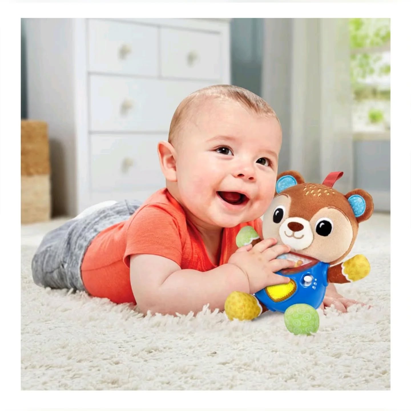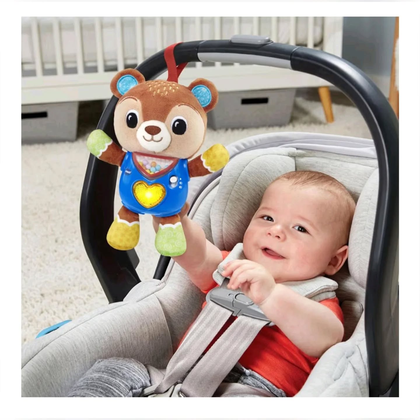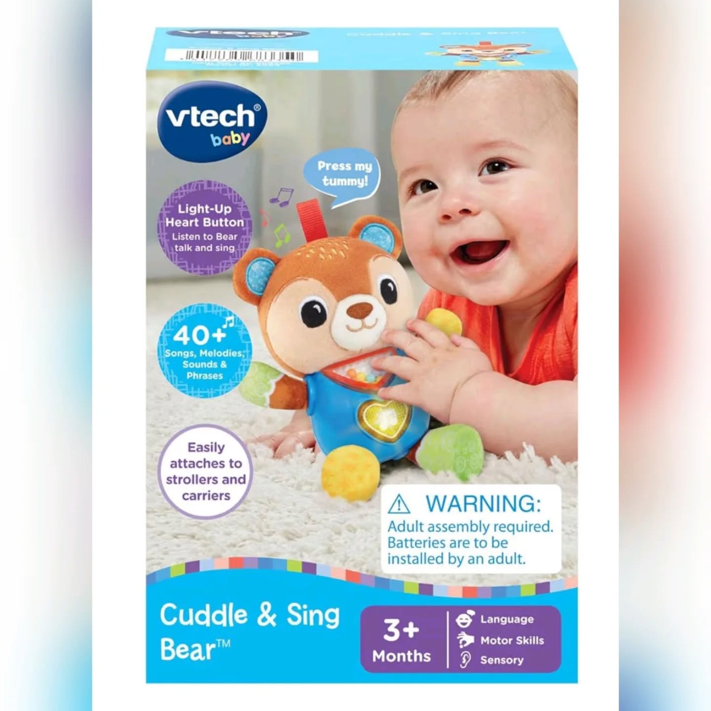 The VTech Baby Cuddle & Sing Bear is a soft, plush stroller and crib toy designed for infants aged 3+ months. This interactive bear features colorful patterns, rattling beads, and a light-up heart button that plays songs and introduces early language and feelings, making it perfect for baby’s development and on-the-go entertainment. Made with soft fabrics, it’s easy for little hands to grab and hold.