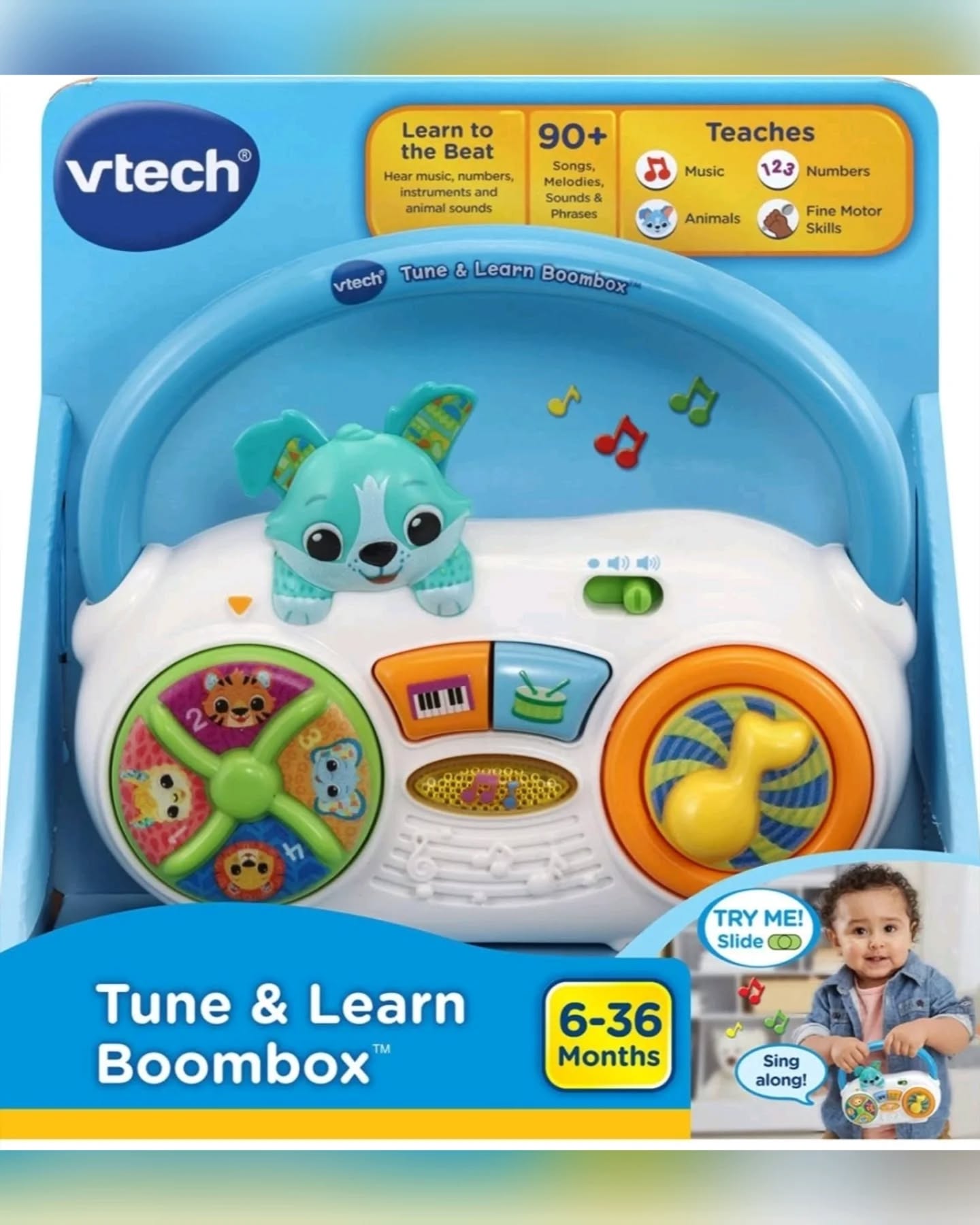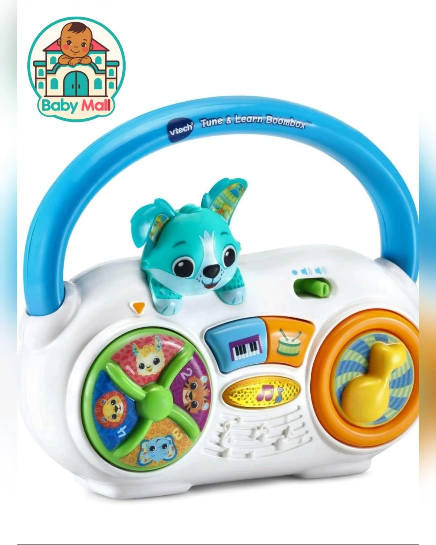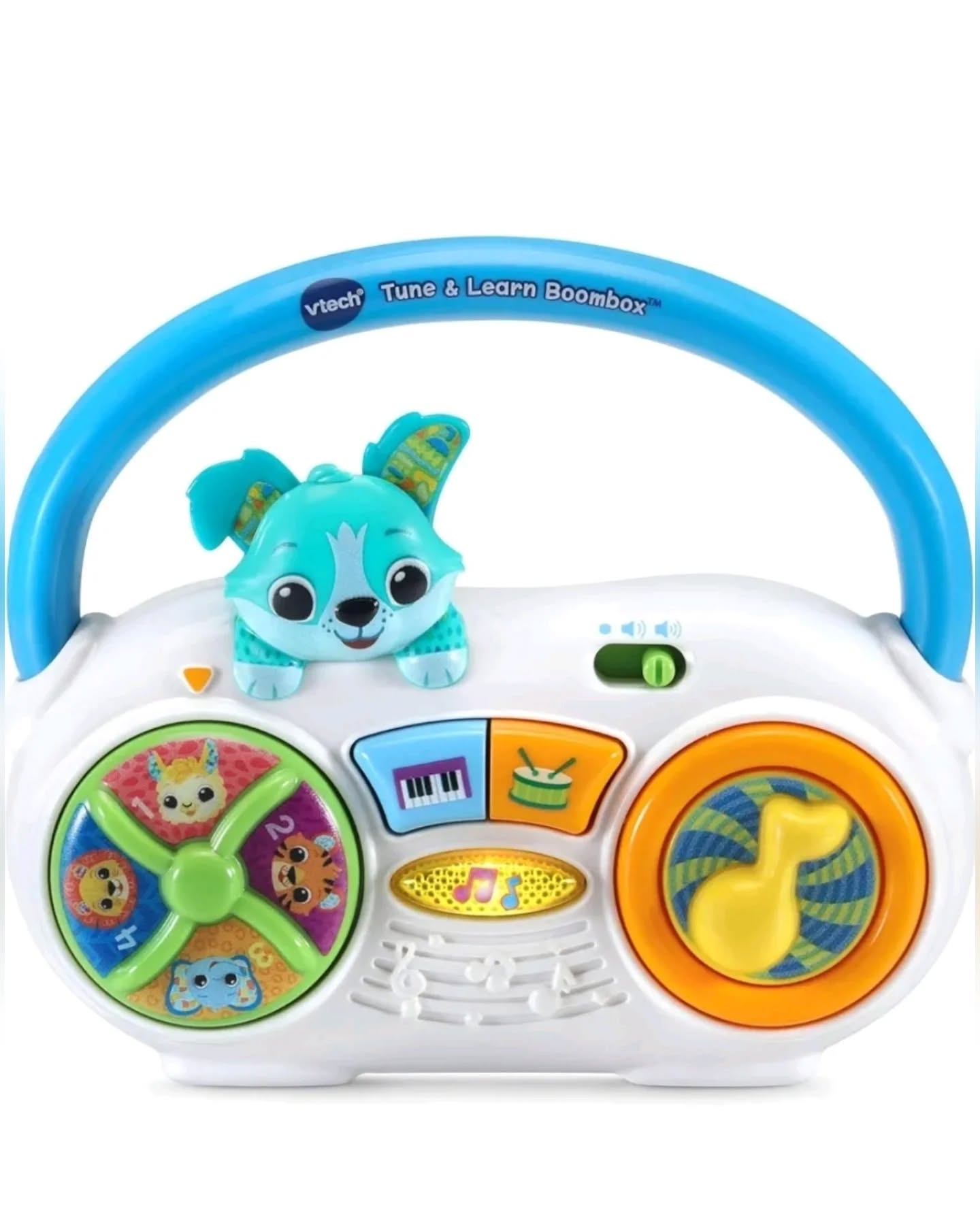 The VTech Tune & Learn Boombox is a vibrant, interactive musical toy designed for babies and toddlers aged 6-36 months. This educational boombox features colorful buttons, a spinning dial with animal faces, and a cute dog character, helping children learn music, numbers, instruments, and animal names/sounds while developing fine motor skills through pressing, spinning, and turning pieces. It includes 3 sing-along songs and 30 pop & country melodies, with an easy-grip handle for on-the-go fun.